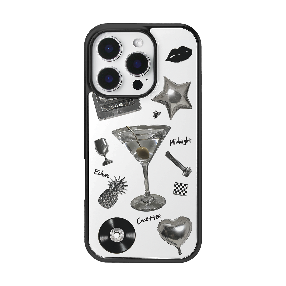 A silver-toned collage of late-night symbols—martini glass, cassette tape, vinyl, and soft reflections.